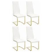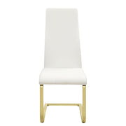 This dining chair brings a sleek, modern aesthetic to any dining space. Its cantilever design offers a floating effect, supported by sturdy gold electroplated metal legs for a luxurious touch. Upholstered in smooth white faux leather, the high backrest and padded seat provide superior comfort and style. The gently contoured shape enhances ergonomic support, making this chair a perfect choice for contemporary interiors. Designed for both elegance and durability, it’s a stunning addition to any dining setting. Key Features: • Modern cantilever dining chair with a sleek, floating design aesthetic • Upholstered in smooth white faux leather for a luxurious, refined look • High backrest and padded seat provide comfort for extended dining • Sturdy metal legs in a gold electroplated finish offer lasting durability • Gently contoured seat enhances ergonomic support and relaxation • A striking choice for contemporary, glam, or modern dining spaces