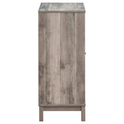 Perfect for compact homes comes this rustic wine cabinet. With a weathered Acacia wood-like finish over the frame, this wine cabinet lends itself to modern farmhouse style living rooms and dining rooms. On the right side are eight wine bottle storage cubbies, along with an open space for storing extra wine accessories. On the left side is a double-door cabinet that hides away all your items neatly inside, with the help of four stemware racks and two open shelves. Each cabinet door also features a matte black round pull that lends a modern flair. Key Features: • Wine cabinet with dual storage configuration and dedicated wine bottle cubbies • Weathered acacia finish adds rustic appeal with a modern farmhouse aesthetic • Two-door cabinet with interior shelving and four integrated stemware racks • Eight bottle compartments and upper cubby offer convenient open display options • Crafted from rubberwood, engineered wood, and laminate veneer surfaces • Matte black hardware and anti-tip kit included for enhanced safety and style