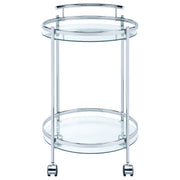 Perfect for entertaining, this modern, rolling bar cart glides from one space to the next. Caster wheels at the bottom even lock in place, creating extra stability as you pour a glass for guests. The slim, round, metal frame makes it a breeze to tuck the cart into corners to create an instant bar station and home bar in tight rooms. Elevating the overall look is a luxe metallic finish that gives off a modern glam aesthetic. Between the gleaming metal frame are tempered glass shelves, allowing light to shine through for a loftier look and feel. Key Features: • Captivating electroplated round bar cart with a harmonious fusion of design and practicality • Constructed from high-quality metal for durability • Two levels of exquisite clear tempered glass shelving offer generous storage space • Equipped with lockable caster wheels for seamless mobility and stability • Elevate your entertaining experience with this versatile and elegant bar cart, perfect for contemporary settings