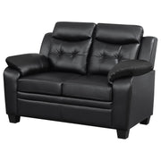 Place this stylish loveseat on its own in a smaller space, or add a matching sofa and armchair for a complete living room set. Either way, you'll be sure to enjoy its soft, soothing comfort and elegant appeal. It features smooth, leather-like upholstery with light tufting along the back. Available in multiple finishes, it pleasingly plays up any room's color motif. Sturdy, tapered legs bolster its durable frame, offering maximum support. Key Features: • Stylish stationary sofa collection • Perfect for small spaces • Soft, breathable, black leatherette upholstery • Ultra-plush headrest and armrests • Subtle tufting on backrests for added style • Durable kiln dried hardwood frame