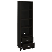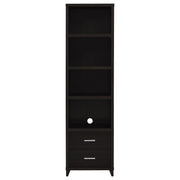 Elevate your entertainment area with this versatile media tower, designed with sleek lines and a cappuccino finish for contemporary appeal. Four open shelves provide ample space to display books, decor, or media devices, while adjustable shelving adds flexibility for customized storage. Two spacious drawers at the base keep accessories neatly tucked away, complemented by brushed silver hardware for a modern touch. Supported by tapered legs, this tower combines practical function with a stylish silhouette to complete your living space._x005F_x000D_ Key Features: • Cappuccino media tower with modern silhouette and brushed silver hardware accents • Four open shelves provide ample space for books, decor, and media accessories • Adjustable shelving offers flexible storage options for customized organization • Two lower drawers add concealed storage for remotes, games, or essentials • Constructed from engineered wood with scratch-resistant laminate veneer finish • Euro drawer glides and tapered legs ensure smooth function and lasting durability