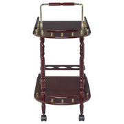 This classy serving cart will look at home in either your formal dining room or rec room. It features a handle pushing and top roomy top shelf for a cheese plate and two snifters of cognac. Bottom shelf includes a bottle holder for three bottles of your favorite Bordeaux and/or single malt. Elegantly crafted with merlot finish and brash-finish metal accents. Gives your room a traditional countryside appeal. Key Features: • Two-tier bar cart with guardrails for secure item transport and display • Merlot wood tone paired with brass-finish accents for a classic look • Integrated three-bottle wine rack keeps favorite bottles securely stored • Swiveling casters allow easy movement between rooms and spaces • Turned legs and raised gallery rails add vintage-inspired detailing • Crafted from rubberwood, engineered wood, paper laminate, and metal