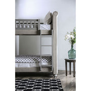 Here's a twin over twin bunk bed that's not only comfortable, but also stylish! The light gray linen-like fabric can be found along the entire frame while rolled ends and nail heads create a sense of grace and charm. The kids will love playing royalty in this padded button-tufted piece!