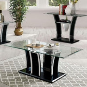 Staten Glossy Black/Chrome Coffee Table, 47 1/4"L X 23 5/8"W X 17 3/4"H, 60.06lbs. Curves define this sophisticated occasional table set. The sweeping sides of the lacquer-coated legs are trimmed in vibrant chrome creating a modern feel to any space. Square glass top elevate the look and create a compact shape that can fit against walls or corners. Features: 8mm Tempered Glass Top Open Bottom Shelf Curved Table Legs Chrome Trim