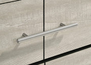 This contemporary two-drawer nightstand brings a chic blend of rustic and modern design to your bedside. Crafted with a rustic cream finish over rough-sawn, white-washed engineered paper veneer, it exudes a warm, textured appeal. Extra-wide polished nickel handles offer a sleek contrast to the rustic tones, adding a touch of sophistication. Built with engineered wood and featuring durable English dovetail joinery and Center metal glides, this nightstand is as functional as it is stylish, providing ample storage in a compact, modern silhouette. Key Features: • Rustic cream finish with rough-sawn, white-washed engineered paper veneer • Extra-wide polished nickel handles for a modern touch • Two spacious drawers with English dovetail joinery • Smooth Center metal drawer glides for easy access • Compact design that complements any contemporary bedroom