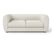 This compact living room ensemble is full of welcomed surprises. The tall arms and low back is an obvious homage to the tuxedo style, but the bulbous shape and smoother lines is a unique twist taking inspiration from the modern era. Underneath the seat cushions are high density foam, making firmer seats than one would expect for the shape that it is in. Finally, soft boucle fabric wraps around the whole piece highlighting a certain air of elegance and quiet class.