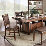 Wichita Light Walnut Dining Table, 75"L X 42"W X 30 1/2"H, 162.8lbs. For the discerning handy person who likes to keep everything closeby in case you need it. This dining set keeps everyone at the table and comfortably eating dinner. Padded leatherette seating keeps people cozy, and an ample storage base means it's ea sy to invite others to grab a plate and enjoy a meal. A matching server table completes the rustic allure. Features: Storage Base Louver Doors Antique Drawer Pulls Wood Grain Details